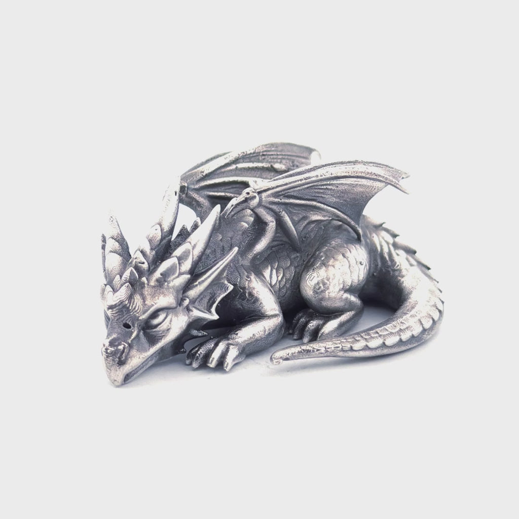 The Sleeping Dragon silver statue captures a rare and powerful stillness, hand-poured from 999+ pure silver and finished with an antiqued patina that emphasizes every delicate scale, curved claw, and tucked wing. In repose yet radiating quiet dominance, this silver fantasy statue symbolizes ancient wisdom, vigilance, and inner power waiting to awaken.