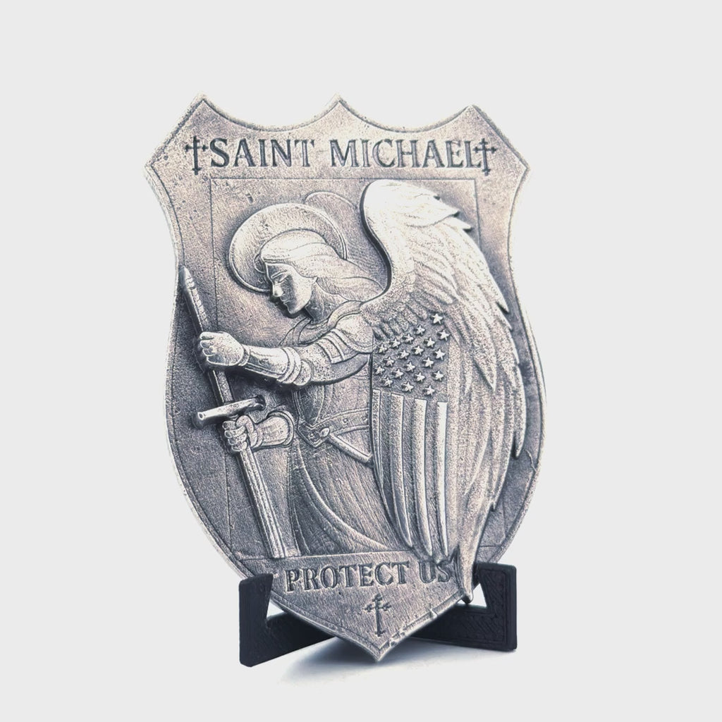 The St. Michael Badge is a bold expression of faith, honor, and unwavering protection—hand-poured in 999+ pure silver and finished with an antique silver patina that brings out every finely sculpted detail. Shaped like a traditional shield, this handcrafted silver statue depicts Saint Michael the Archangel with sword drawn, cloaked in an American flag-draped wing, and the words “Protect Us” engraved at the base. It’s a tribute to guardianship and courage—designed to resonate deeply with veterans, first responders, and anyone facing life’s battles.