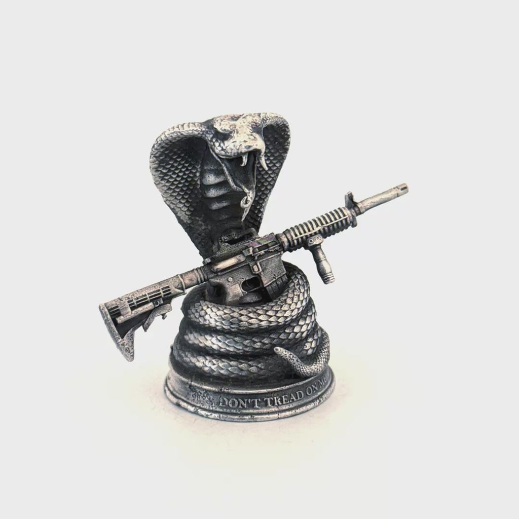 Unleash the power of artistic innovation and pure metal craftsmanship with our "Don't Tread On Me Series 1" hand poured silver statue. This captivating piece features a fiercely coiled cobra, exuding a sense of strength and resilience. The snake's scales are meticulously detailed, showcasing the precision of advanced 3D printed casting resin used in its creation. Resting atop the cobra's coil is the symbol of defiance and liberty - an AR-15, rendered with an exceptional level of detail that speaks to the statue's blend of artistry and innovation.