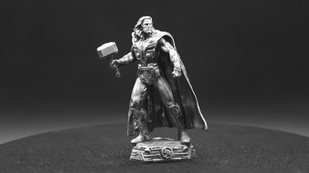 • Design: The "Thor" statue features Thor in a heroic pose, wielding Mjölnir, his legendary hammer, symbolizing his power over thunder and battle. This design captures Thor's strength and heroism, achieved through the sophisticated techniques of vacuum-assisted investment casting and 3D printed casting resin, showcasing intricate detailing that brings the character to life.
